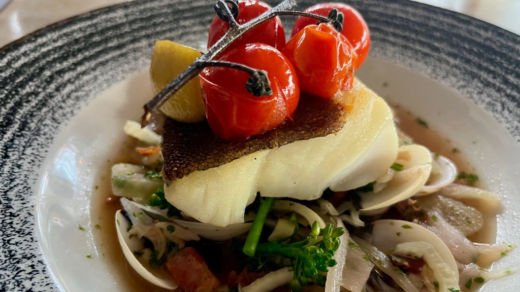 We’re back at the inn for dinner our second night and we try two things from their menu. A delicious risotto with lemon, goat cheese and asparagus and their baked cod with broccoli, chorizo and clams which they alter to make dairy free. Both good, but the risotto is better.